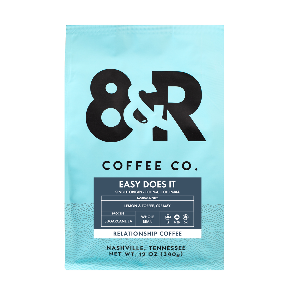Take it slow with Easy Does It, our decaf Colombian coffee blend with all of the flavor, none of the caffeine. This medium roast coffee contains tasting notes of bright lemon as well as sweet and salty toffee for a creamy yet crisp flavor.
